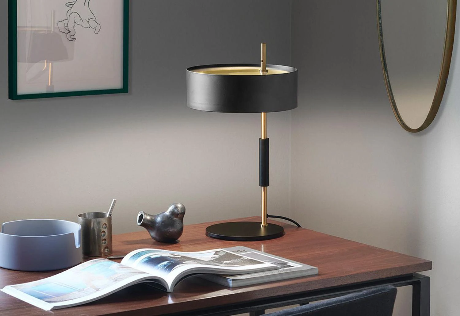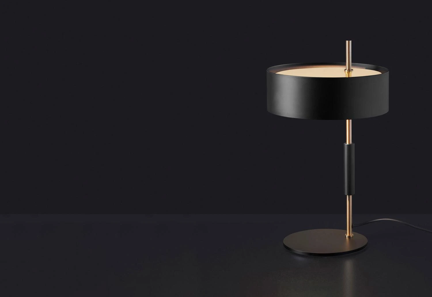 The table lamp is a reissue of the classic mid-century design. Its minimal and streamlined form elegantly evokes the simple style of those years. The traditional cylindrical shade is beautifully contrasted with the satin gold-finished frame.Â
