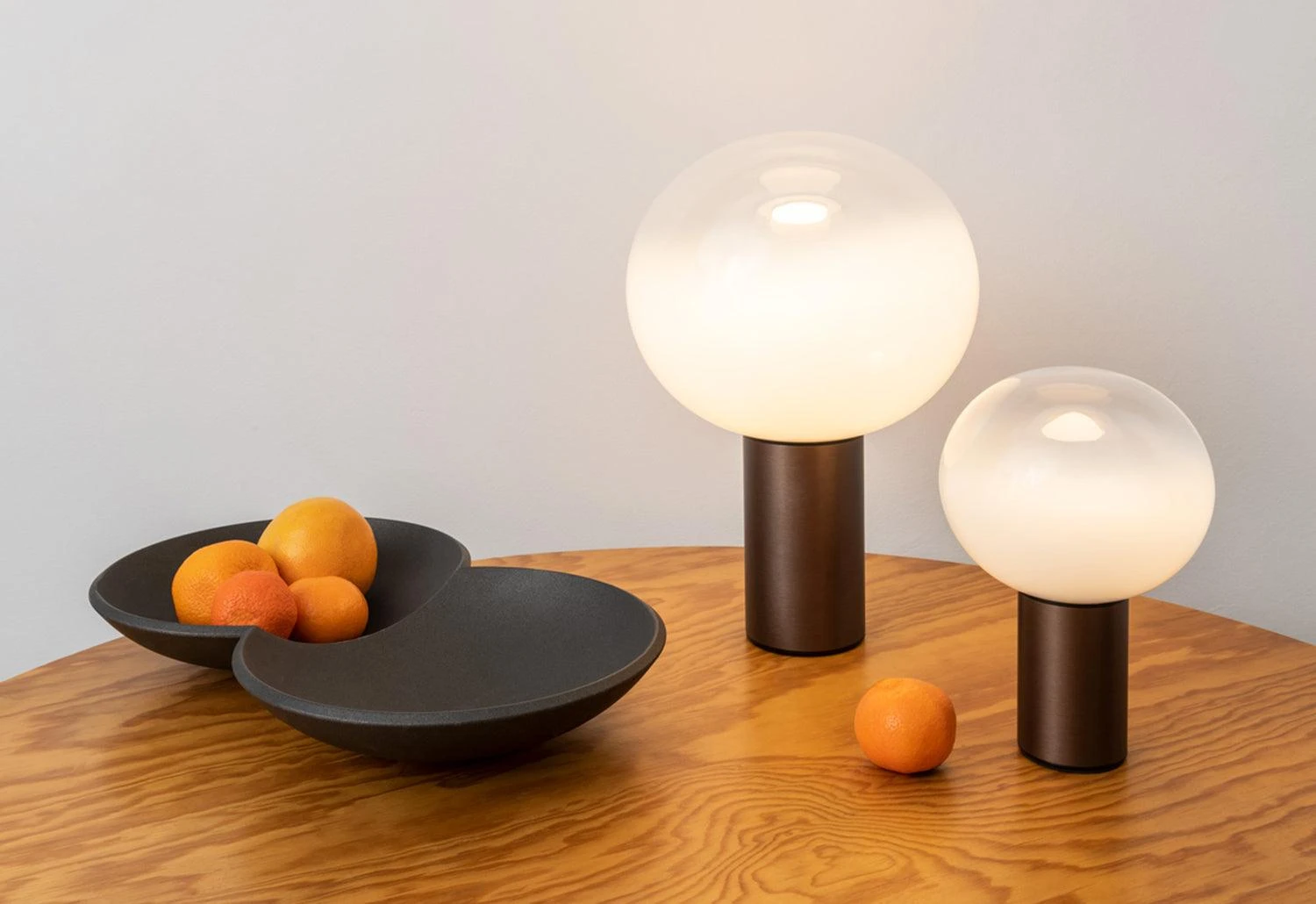 Spherical table lamp with raised base provides a softly diffused light on the table top and casts a warm light in its surrounding environment. This modern and elegant table features hand-blown glass mounted on an aluminium base that is finished in either brass or bronze.Â