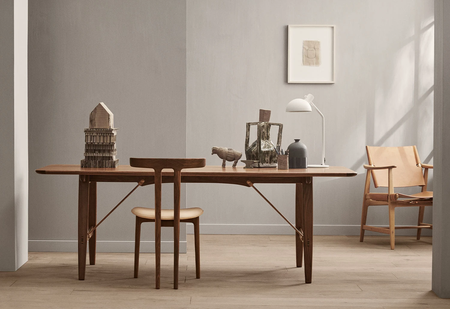 Designed for the Copenhagen Cabinetmakers’ Guild Furniture Exhibition in 1950, the BM1160 Hunting Table is a modern and robust wood table by Børge Morgensen. Stylish and practical, this table is adaptable and suited to small intimate settings.Â