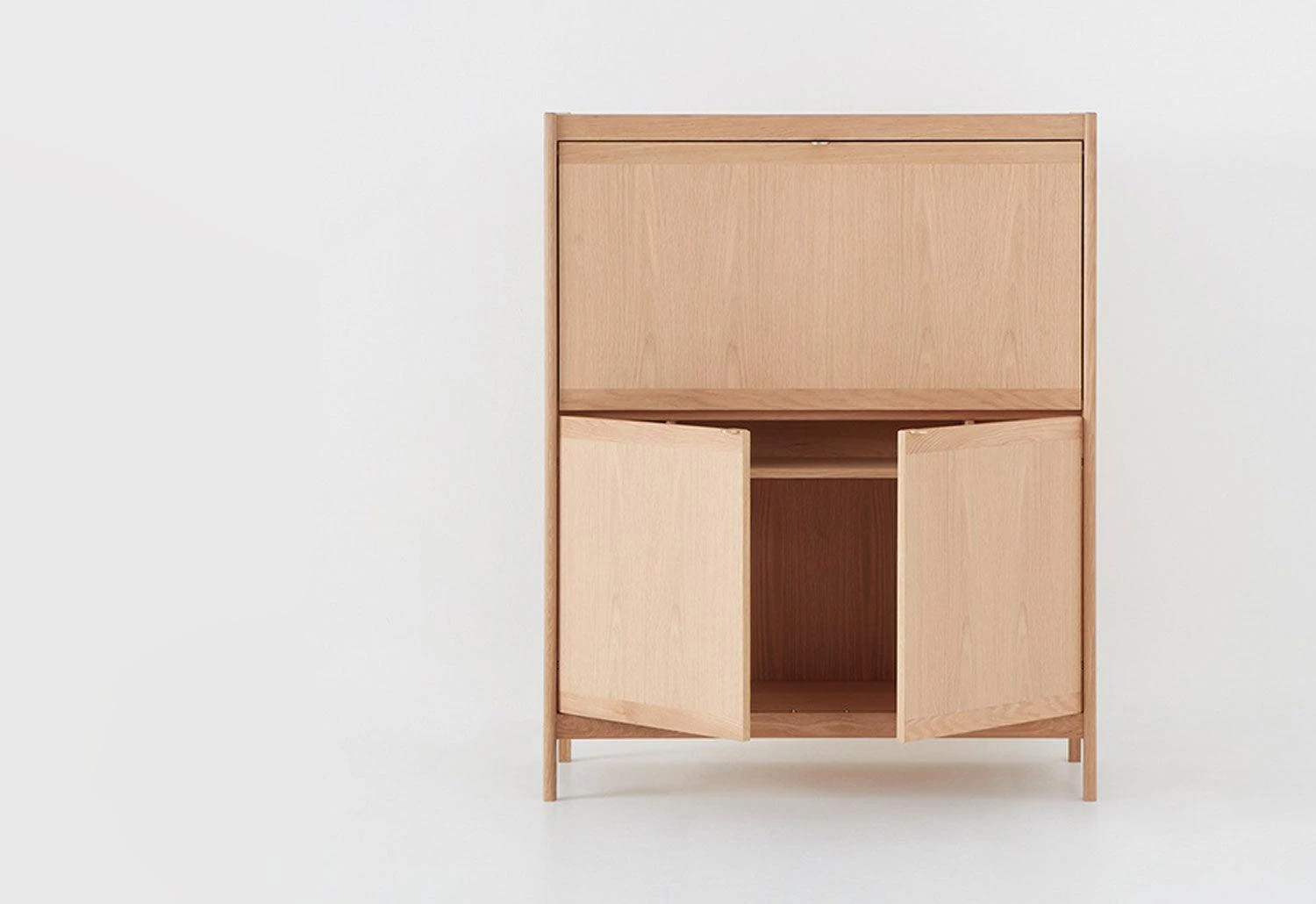 Adopting the customary fold-down element of traditional bureaus, the design has been updated to remove any visual cues of working life; whilst a traditional bureau would feature an angled front, the Davenport Bureau has an even horizontal surface that reads as a cabinet when closed.