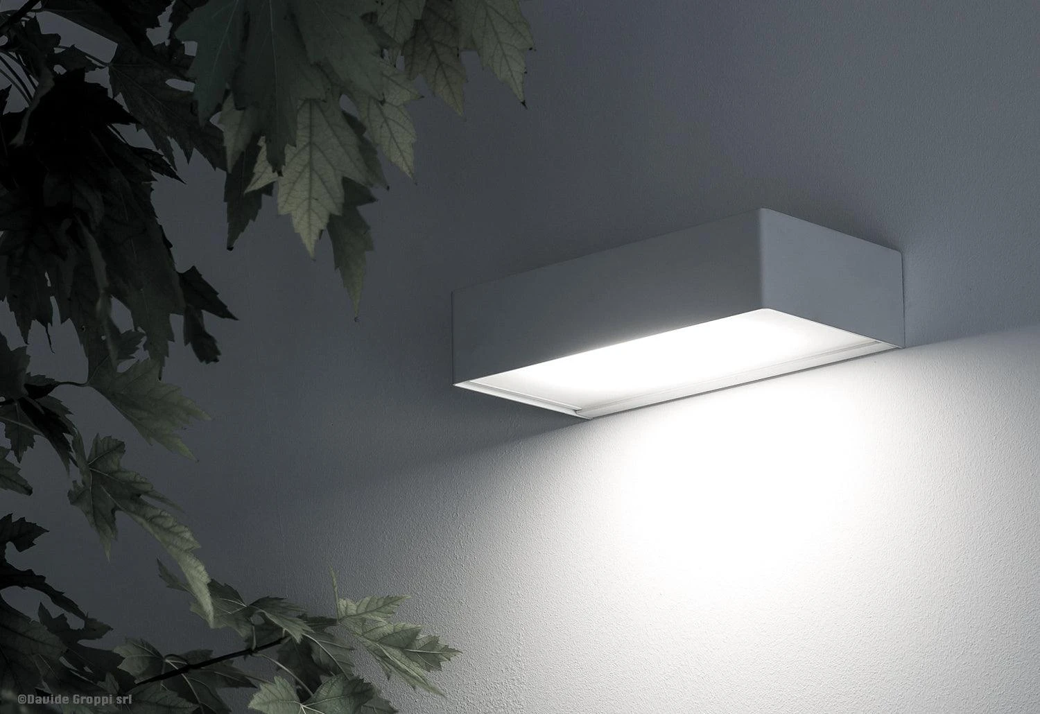 A minimalist outdoor LED wall lamp ideal for providing downlighting and imparting a fresh and modern architectural feel to facades, gardens and outdoor spaces.