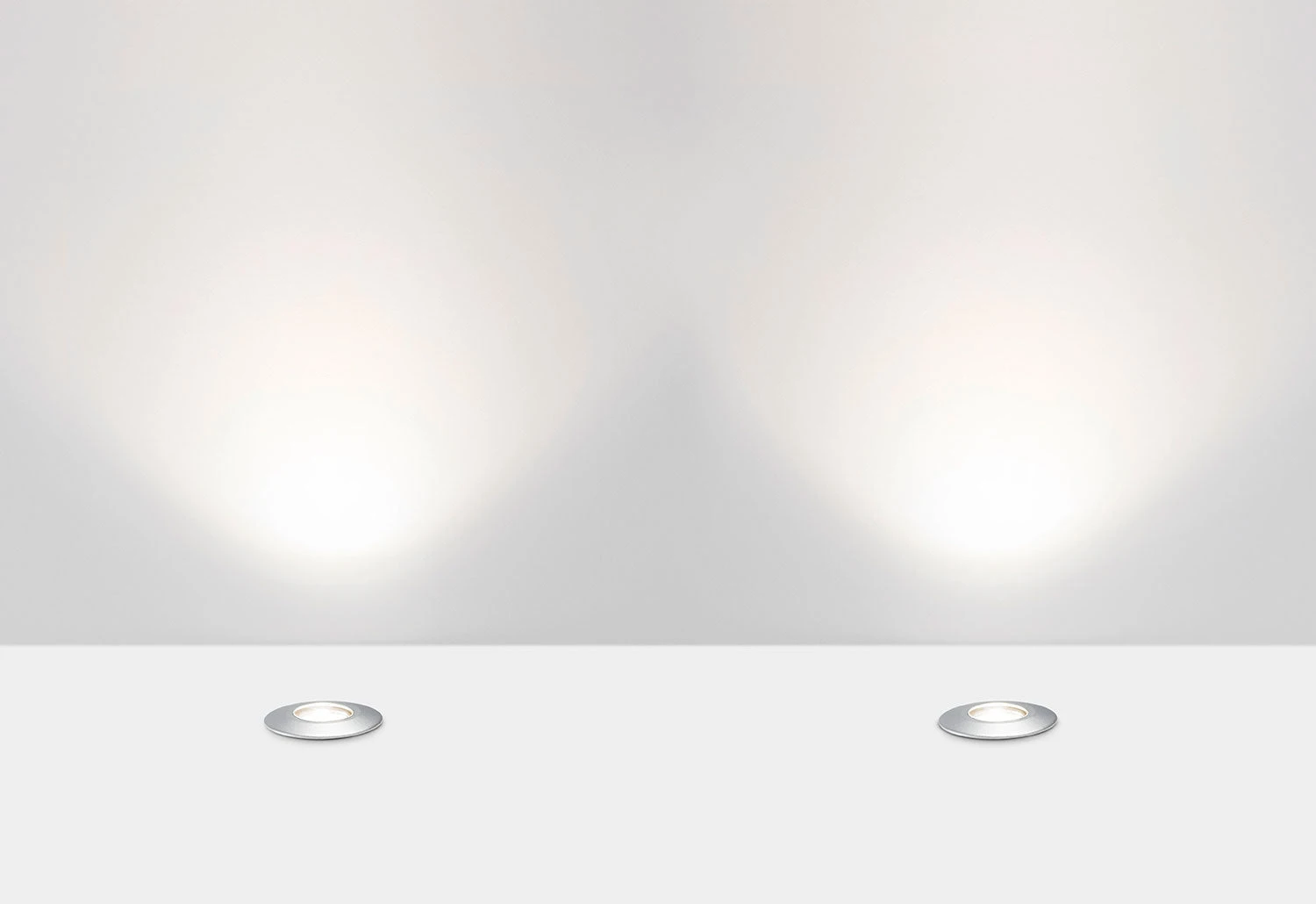 The Lux Outdoor light is a recessed LED spotlight for use above ground outdoors or up to 1 metre underwater. It is available in two finishes; sanded chromed brass or techno-polymer body, and has glass protection and a waterproof cable gland.