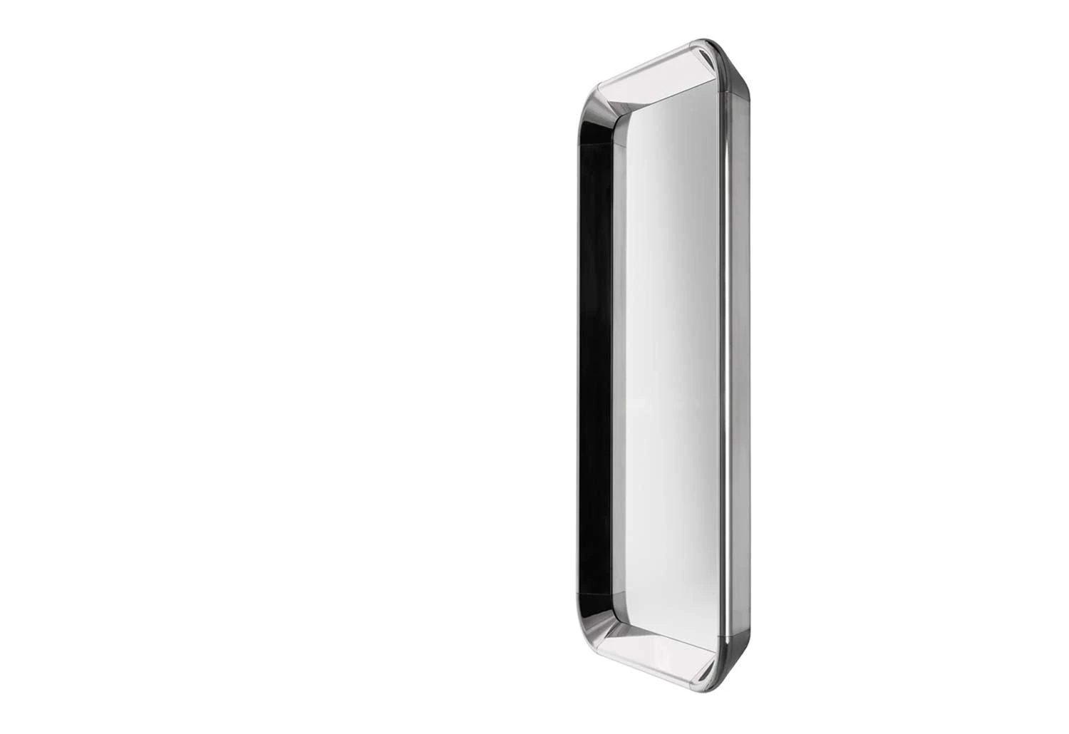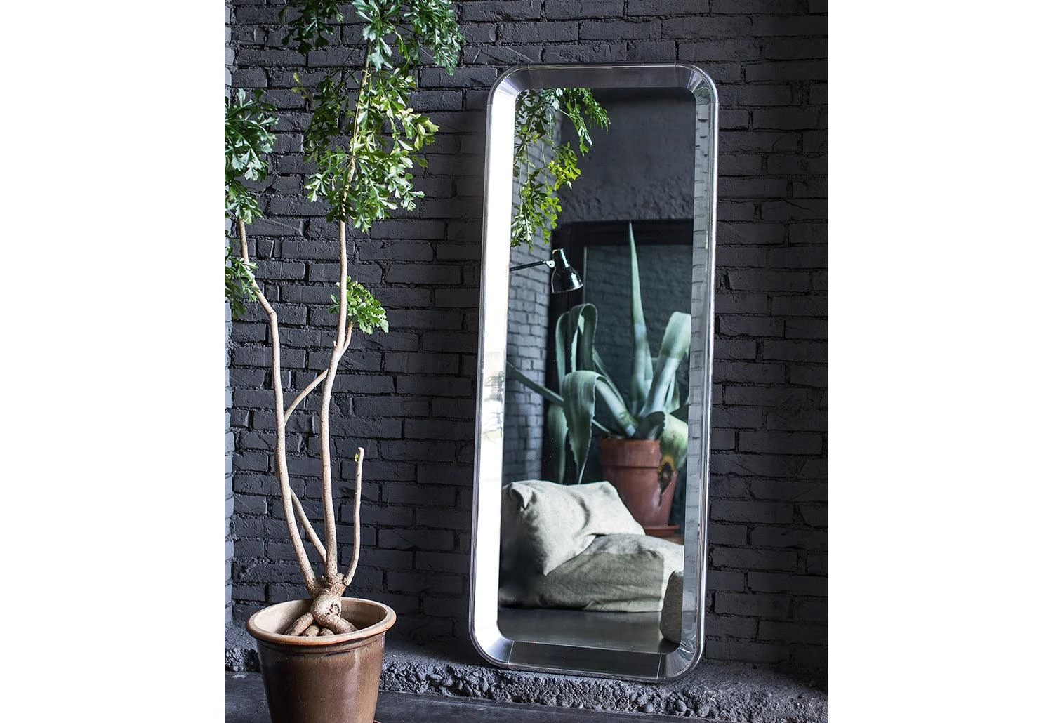 A framed wall or floor mirror with a curved edge. Available in polished aluminium.