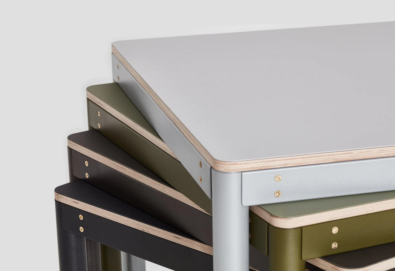 Available in three different sizes in both square and rectangle and in colourful linoleum, the Metal Dowel table can be adapted to suit any space.Â
