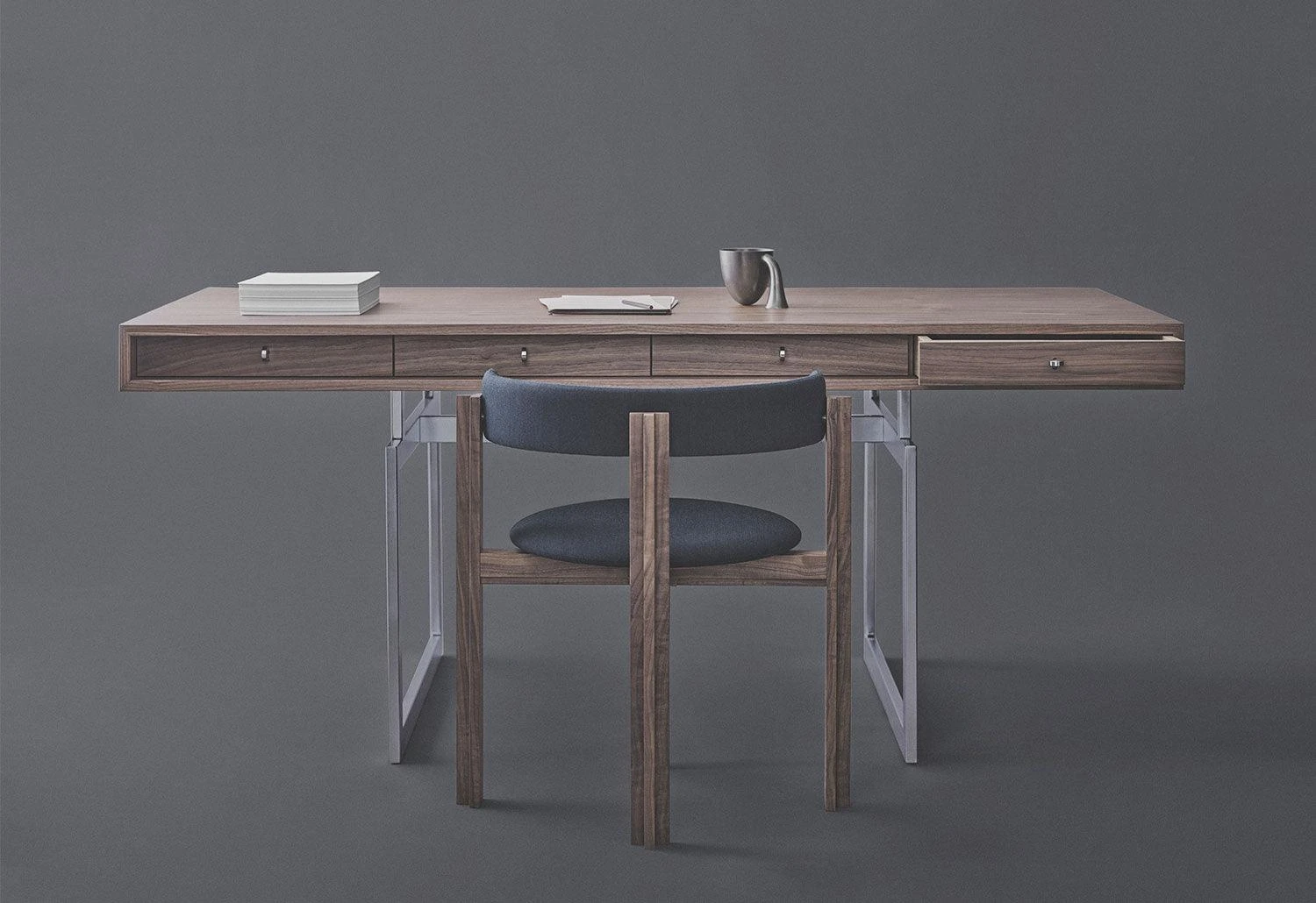 The timeless and iconic desk was pioneering at the time of its design; it was the first of its kind with its simple and minimalist design. Reflecting Kjaer’s architecture background, the tabletop is supported by the slender contrasting metal legs, appearing to be levitating above the frame. The Office Desk has also been coined as the ‘James Bond desk’ as it was featured in three early Bond movies.