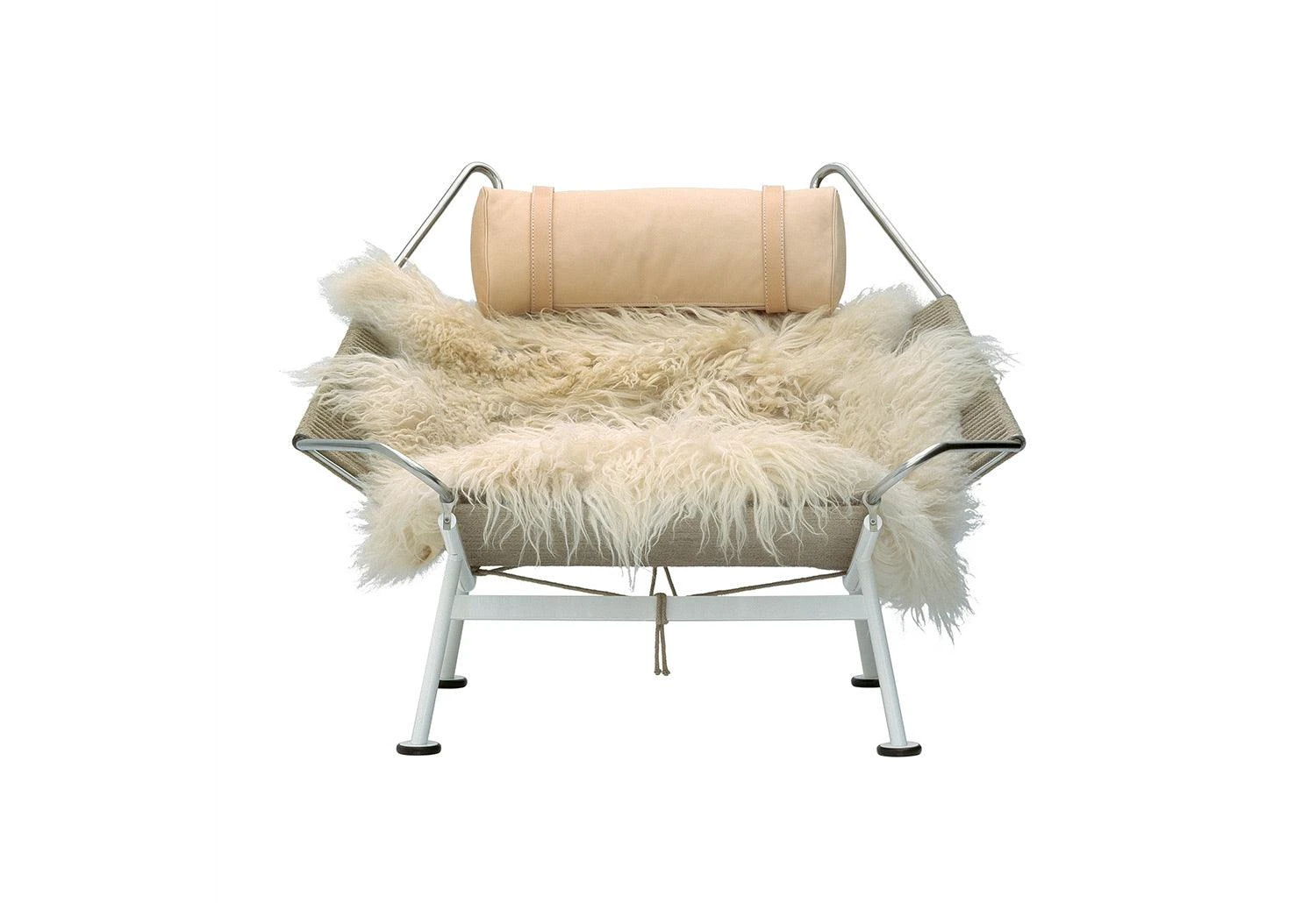 The Flag Halyard Chair by Hans Wegner is truly one of a kind. Made of solid stainless steel, specially developed flag line and long-haired sheepskin, it is the ultimate relaxing luxury.