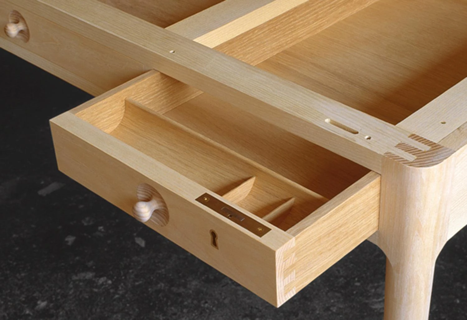 This desk is a classic piece of Danish craftsmanship: simple, functional and modest. Yet it takes a skilled cabinet maker to achieve such a detailed level of work.