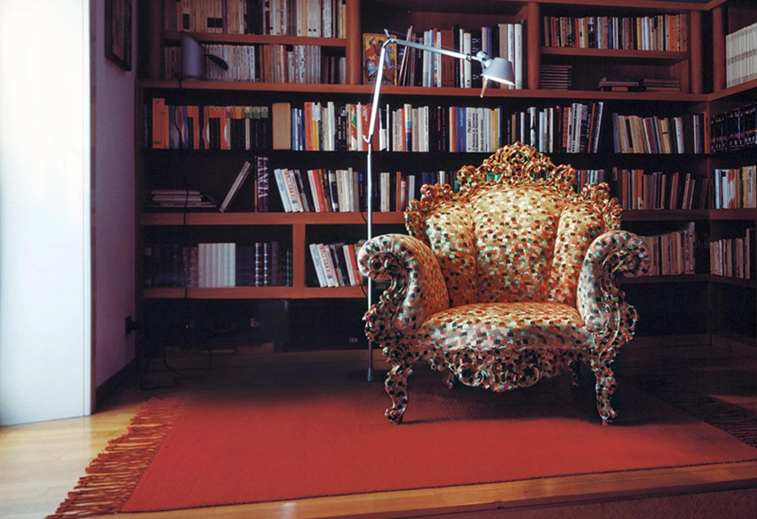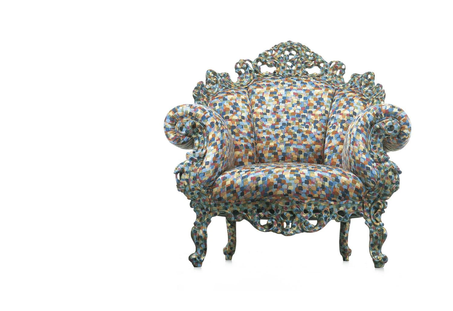 The Proust armchair looks to the Neo-Baroque style of 18th century France for its design inspiration. Mendini covered the chair complete with a colourful, hand-painted swarm of dots which reproduced an enlarged section of a Pointillist painting by Paul Signac.Â