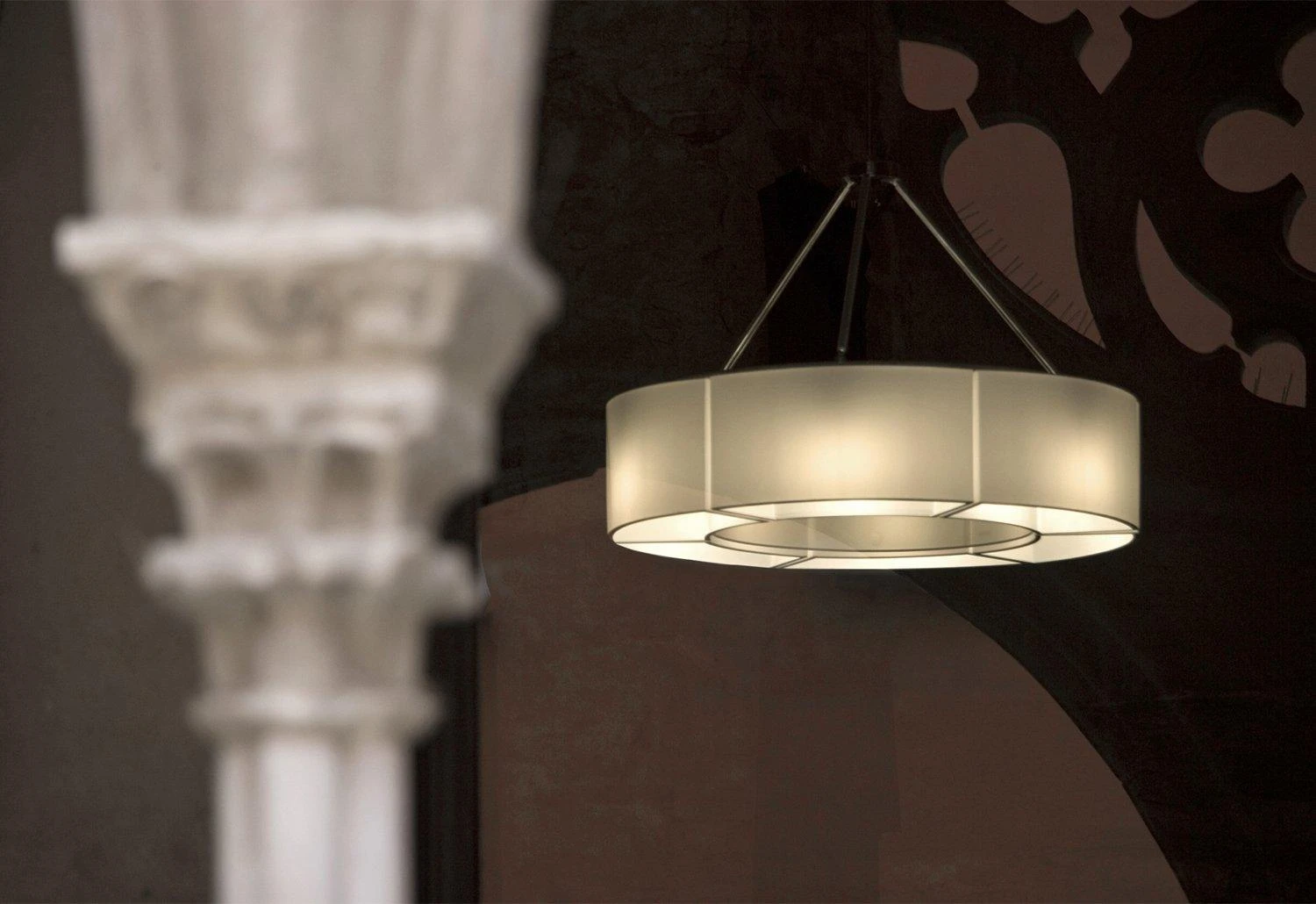 The Sexta hanging lamp consists of a double circle of light divided into six 60° sections that revisits the secular tradition of the old iron luminaires.