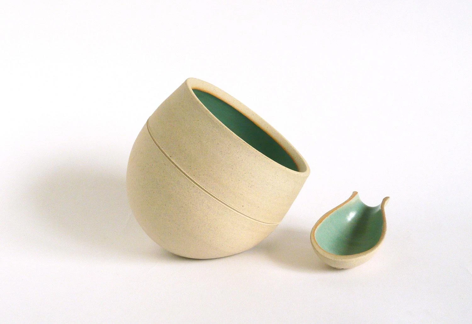 Pat O’Leary’s deceptively simple pieces are finished with opaque gloss and semi-matt glazes. O’Leary is interested in simple contemporary forms with contrasting finishes. Each piece is glazed only on the inside, while the raw clay finish of the exterior emphasises the clean lines and the shape and texture of each vessel.