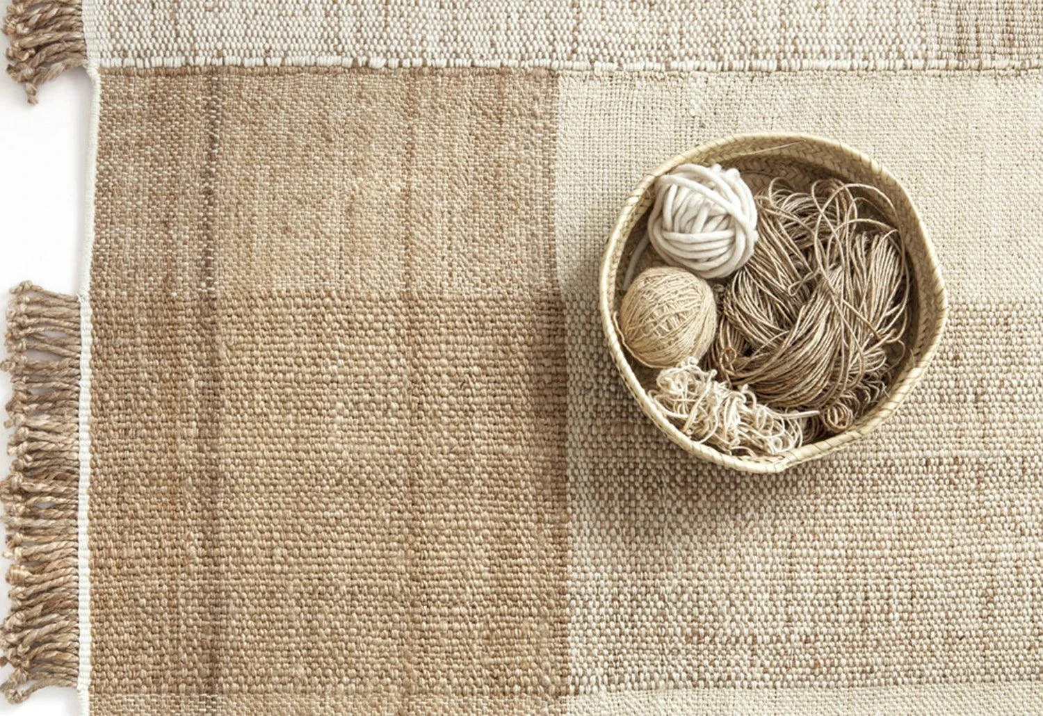 Shades of beige, ivory, and off-white are expertly blended in this Indian flat-weave. A charming irregularity comes from the differing thicknesses of the fibres and their crossing points with one another.
